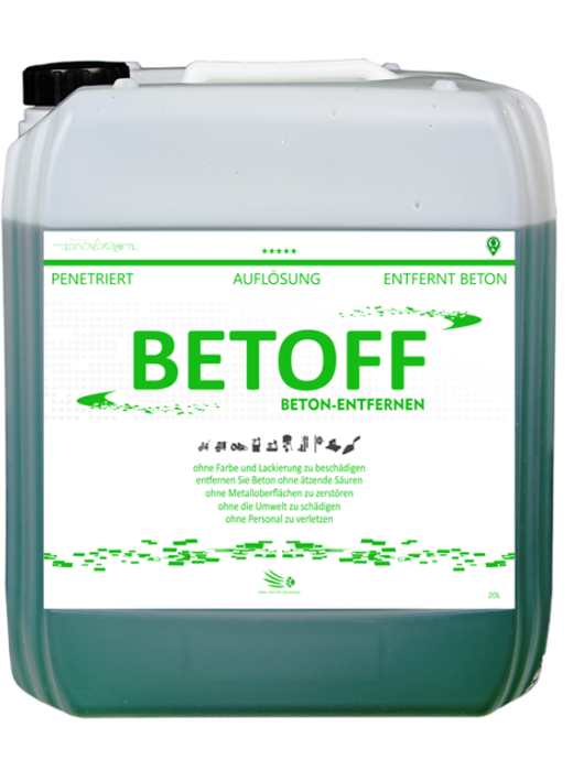 Det er det sikreste produkt til opløsning af beton og andre byggeblandemidler på markedet! BETOFF er kendetegnet ved en innovativ formel og adskiller sig fra der andre midler der fjerner betonsnavs ved at det ikke er skadeligt for hud og at det ikke afgiver dårlig lugt.