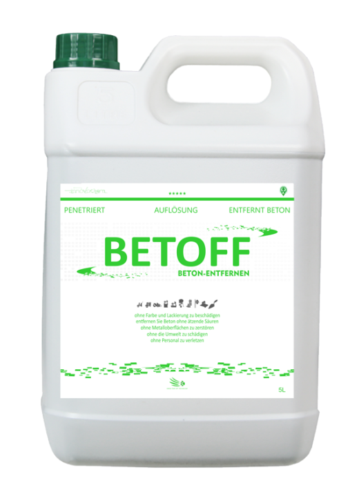 BETOFF er et stærkt og effektivt produkt til fjernelse af besværligt og permanent beton-, cement og kalksnavs samt alle andre slags bygningsbindemidler. Koncentratet fjerner snavset fra byggeværktøj og byggeudstyr.