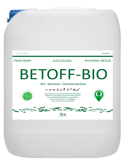 BETOFF-BIO er et præparat som egnes til alle slags følsomme og delikate overflader såsom karosseri, lak, ruder og mange flere! Det er et ikke-ætsende middel, som dog er lige så stærkt som andre – ætsende – betondestruktive midler på markedet.